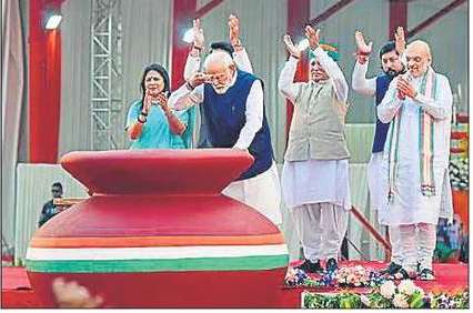 モディ首相はアムリット・カラッシュに土を捧げ、「ミティ」で額に「ティラック」を塗った。PTI
